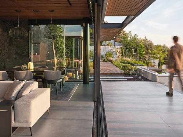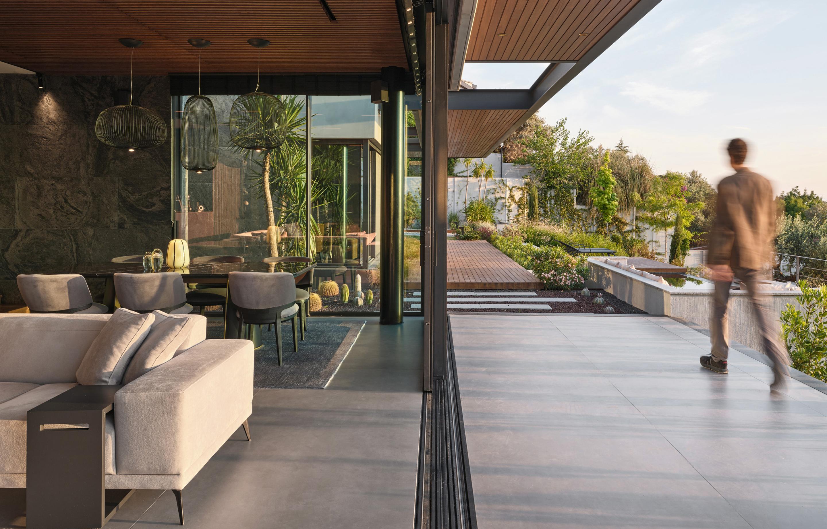 Carved into the hillside, the house engages the terrain through a restrained architectural language. Its linear form follows the site’s natural contours, while expansive glazing blurs the boundaries between interior and exterior. Framed views of the Aegean Sea and olive groves anchor the home in its context, with all living spaces organized to enhance this uninterrupted visual connection.