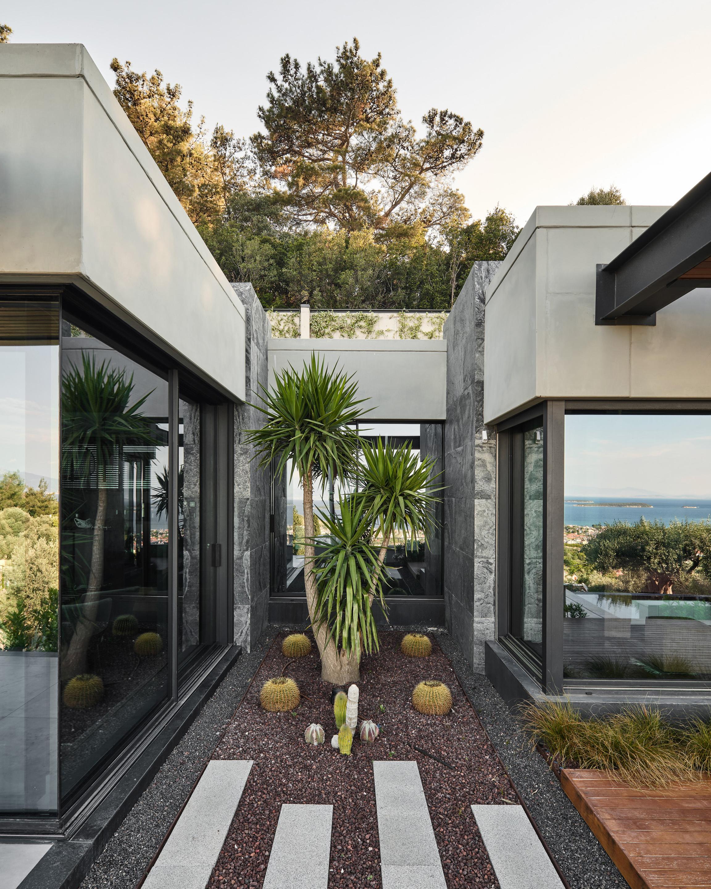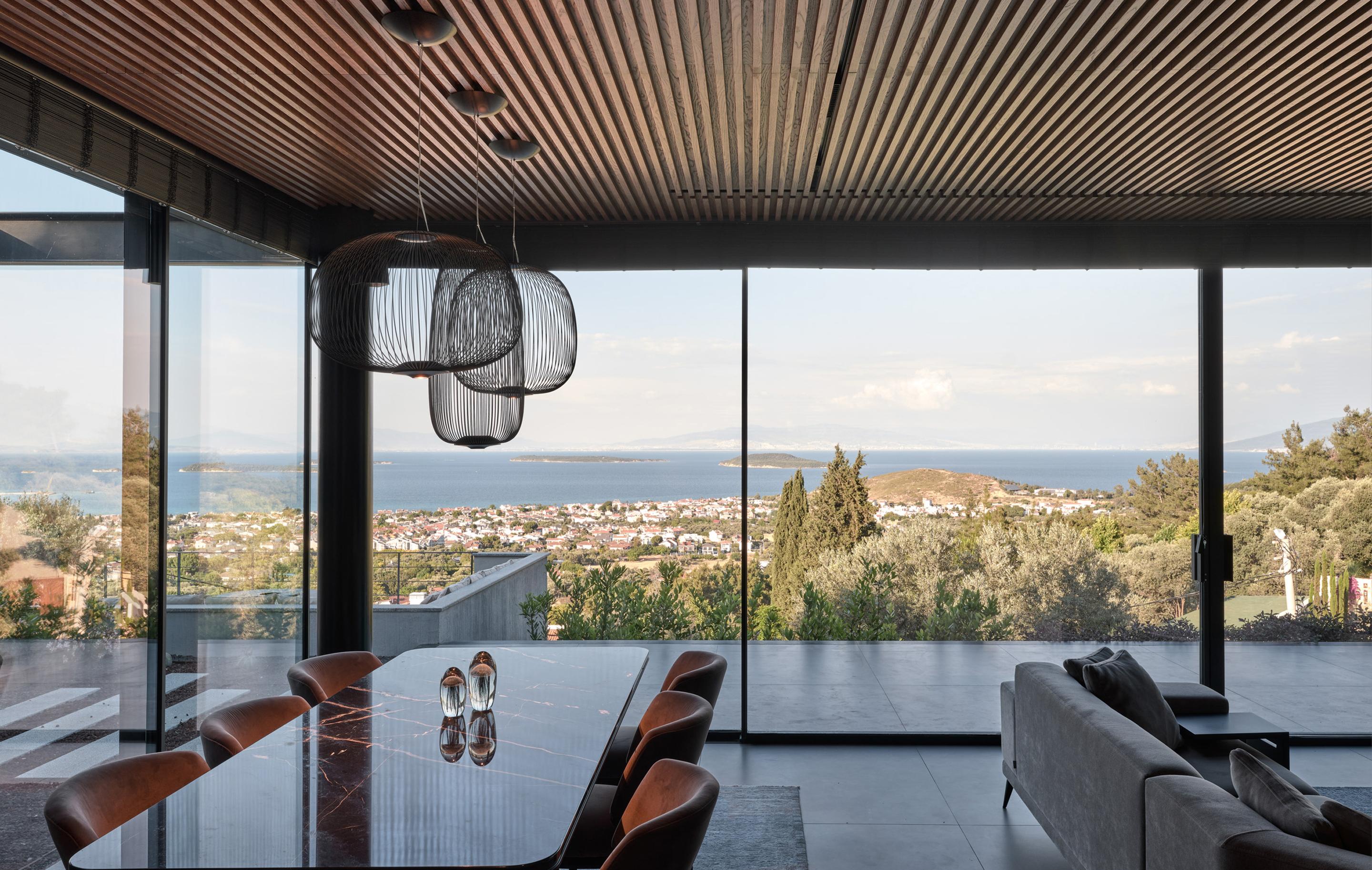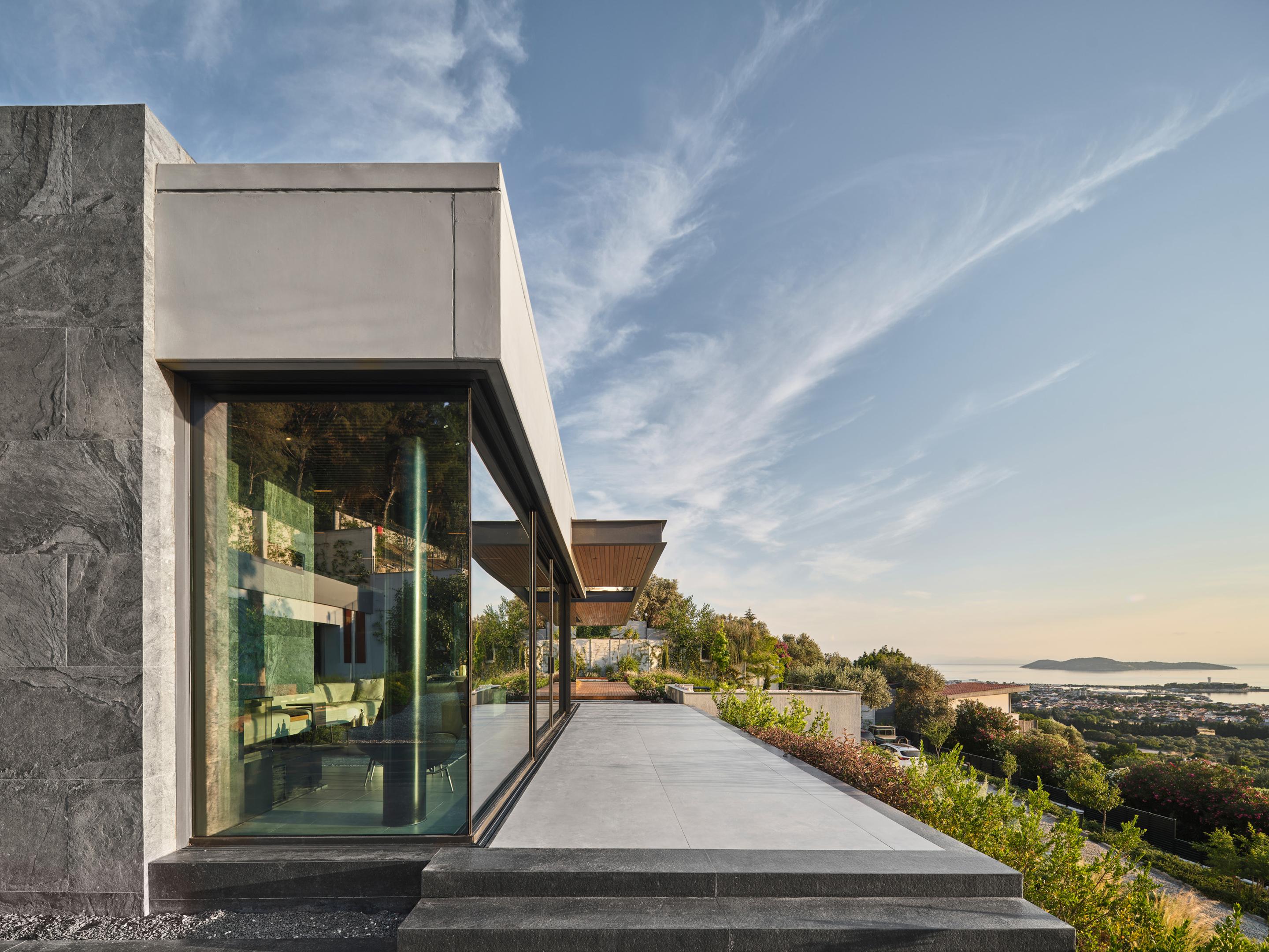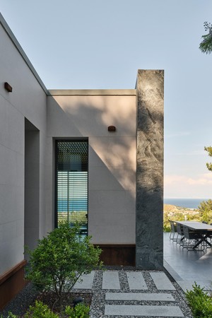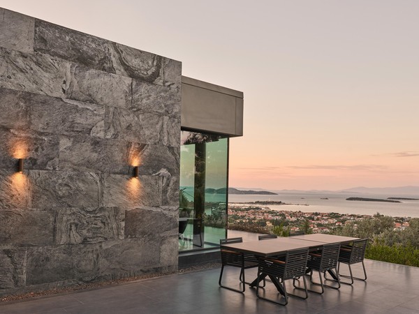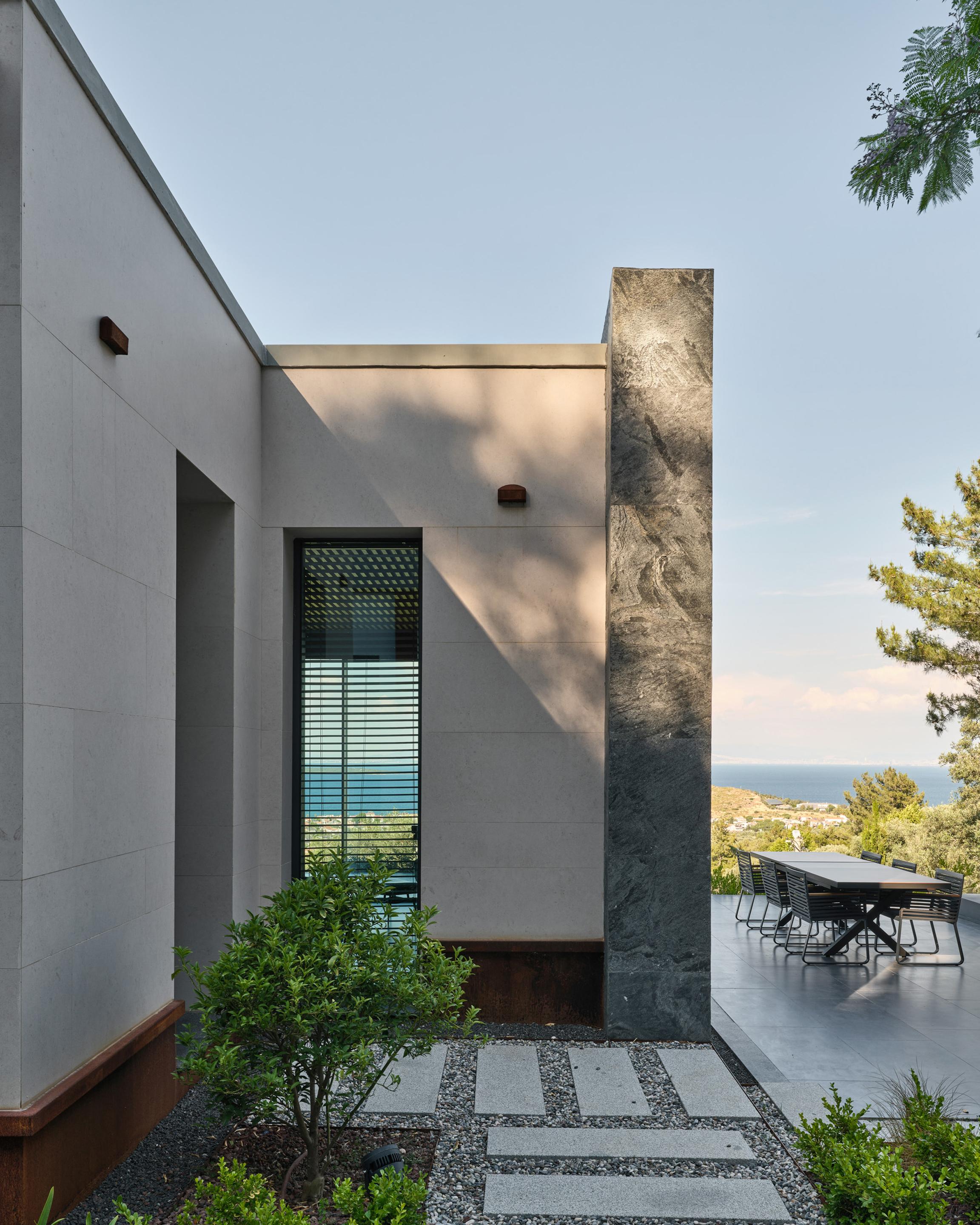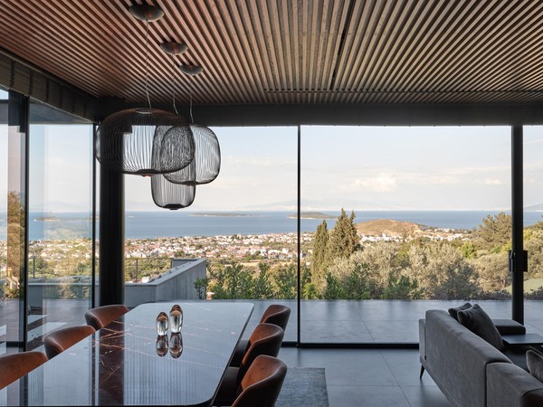 Carved into the hillside, the house engages the terrain through a restrained architectural language. Its linear form follows the site’s natural contours, while expansive glazing blurs the boundaries between interior and exterior. Framed views of the Aegean Sea and olive groves anchor the home in its context, with all living spaces organized to enhance this uninterrupted visual connection.