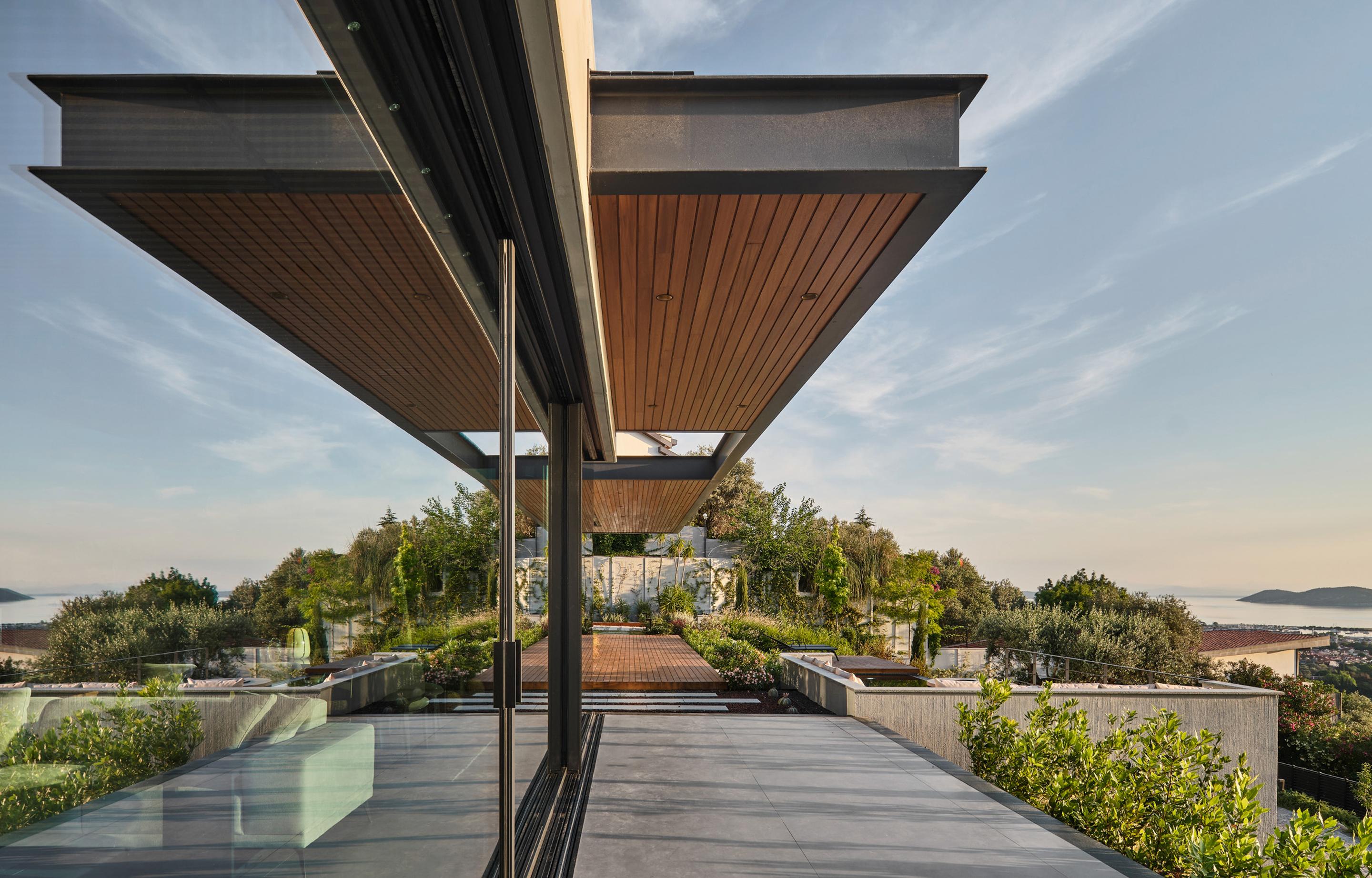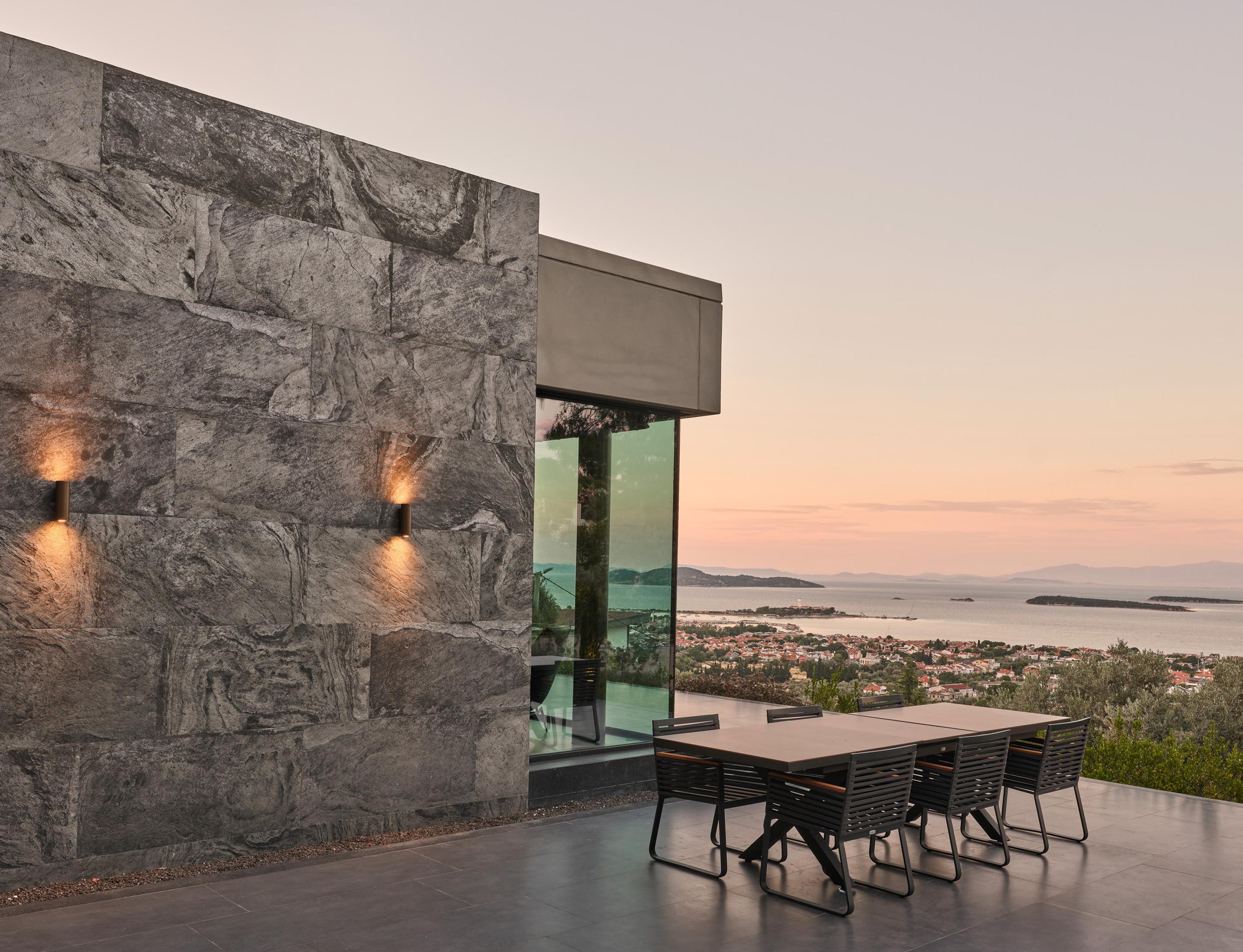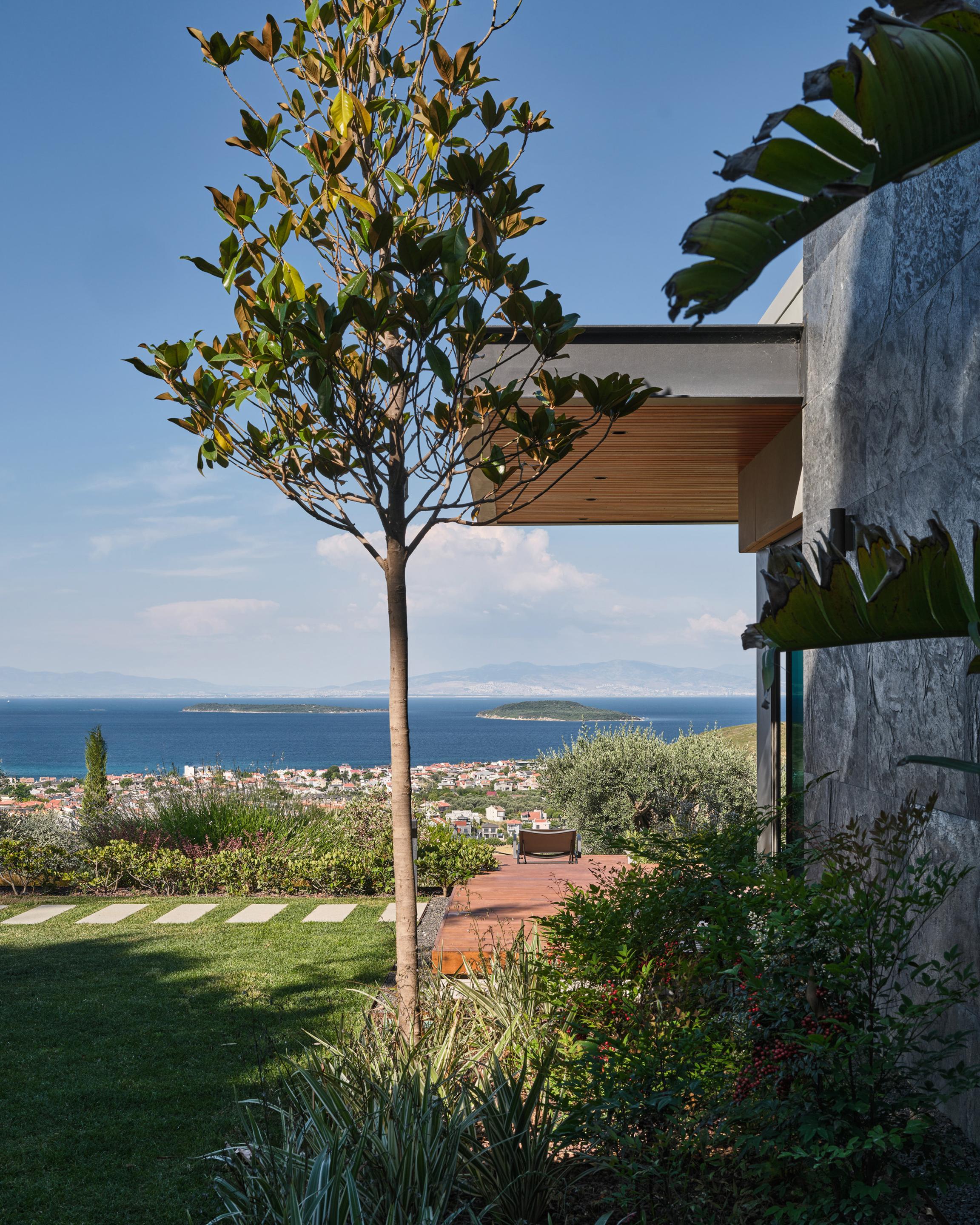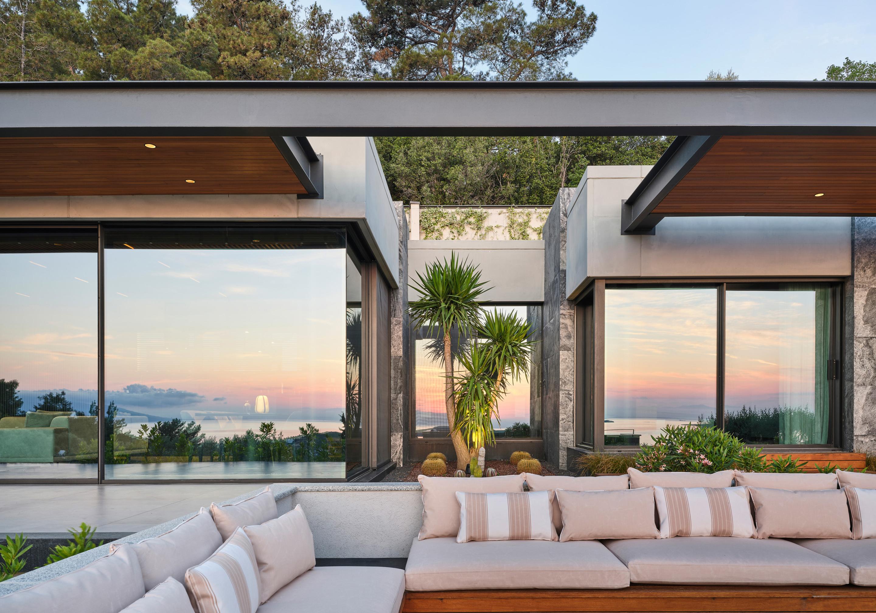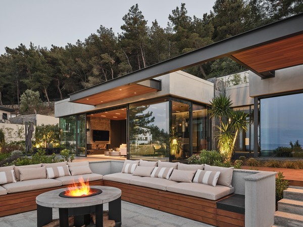 Carved into the hillside, the house engages the terrain through a restrained architectural language. Its linear form follows the site’s natural contours, while expansive glazing blurs the boundaries between interior and exterior. Framed views of the Aegean Sea and olive groves anchor the home in its context, with all living spaces organized to enhance this uninterrupted visual connection.