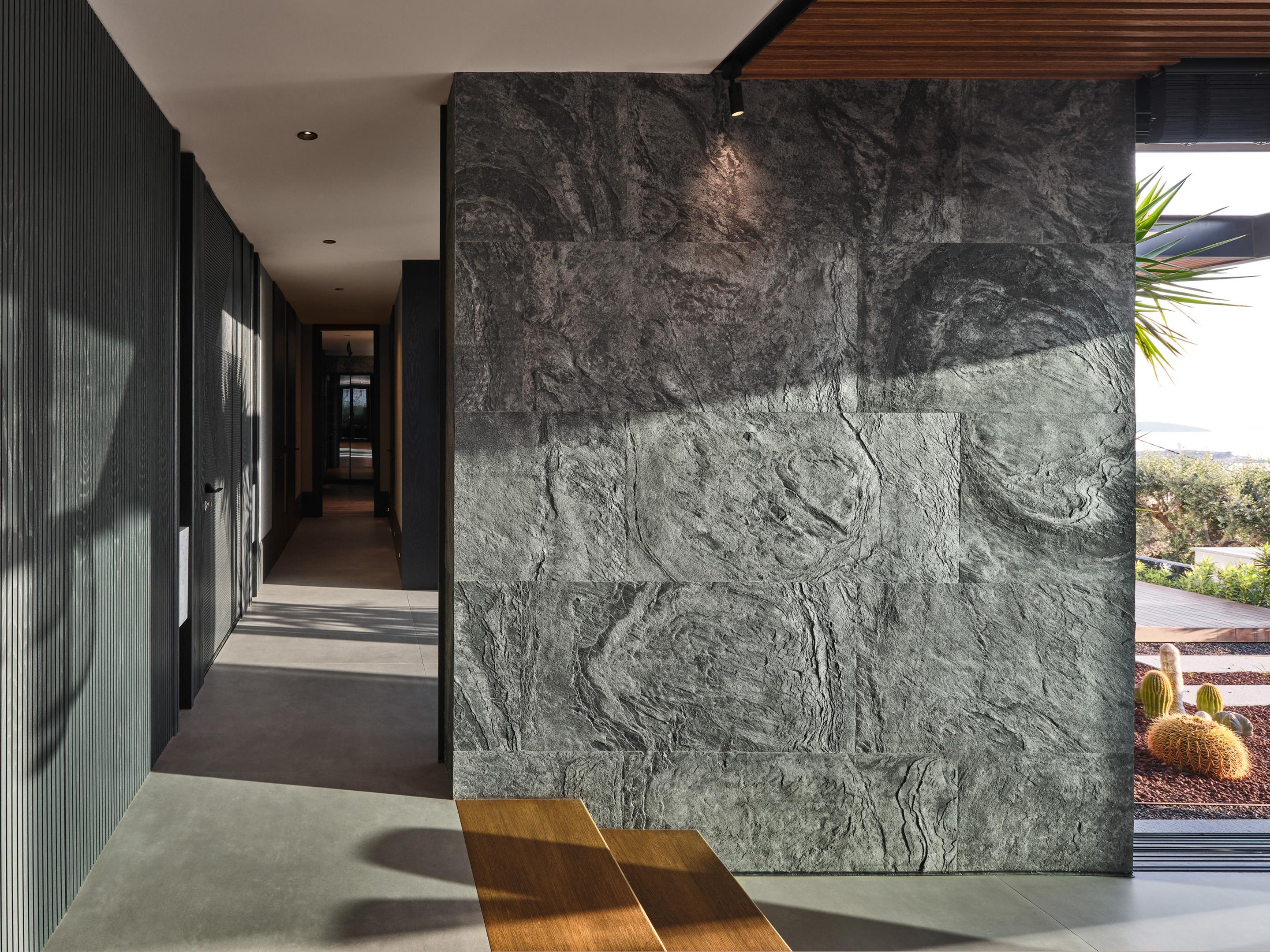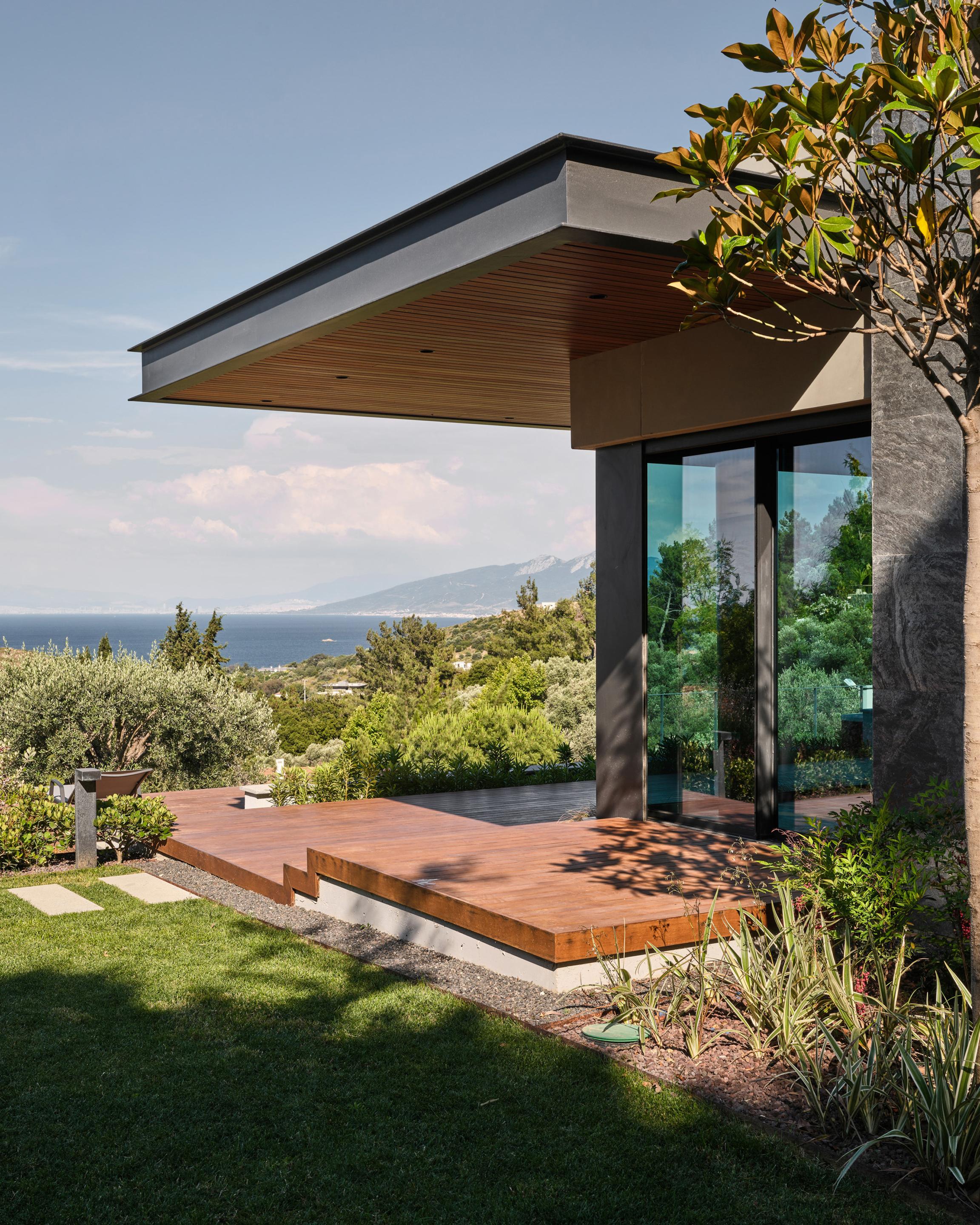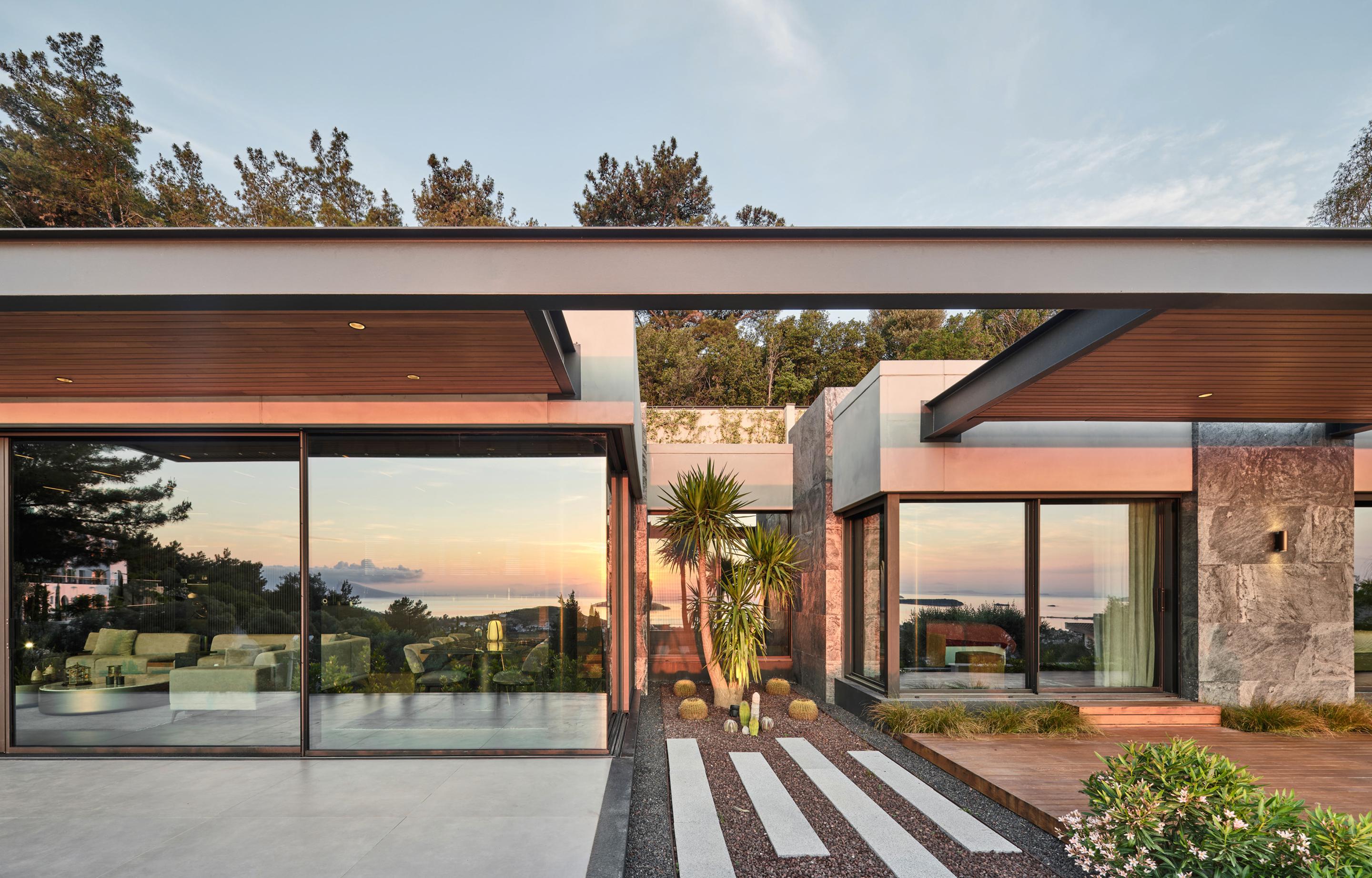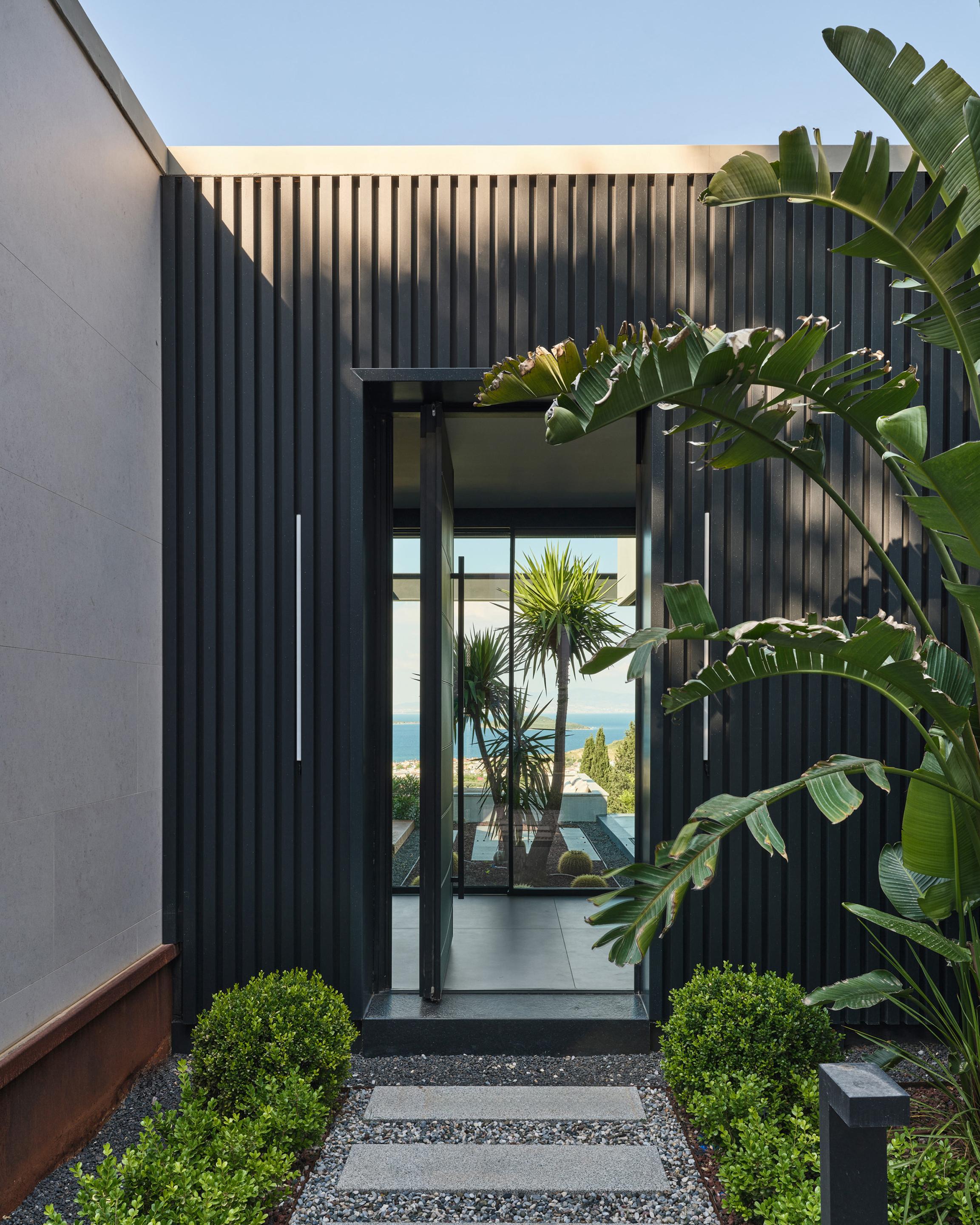 Carved into the hillside, the house engages the terrain through a restrained architectural language. Its linear form follows the site’s natural contours, while expansive glazing blurs the boundaries between interior and exterior. Framed views of the Aegean Sea and olive groves anchor the home in its context, with all living spaces organized to enhance this uninterrupted visual connection.