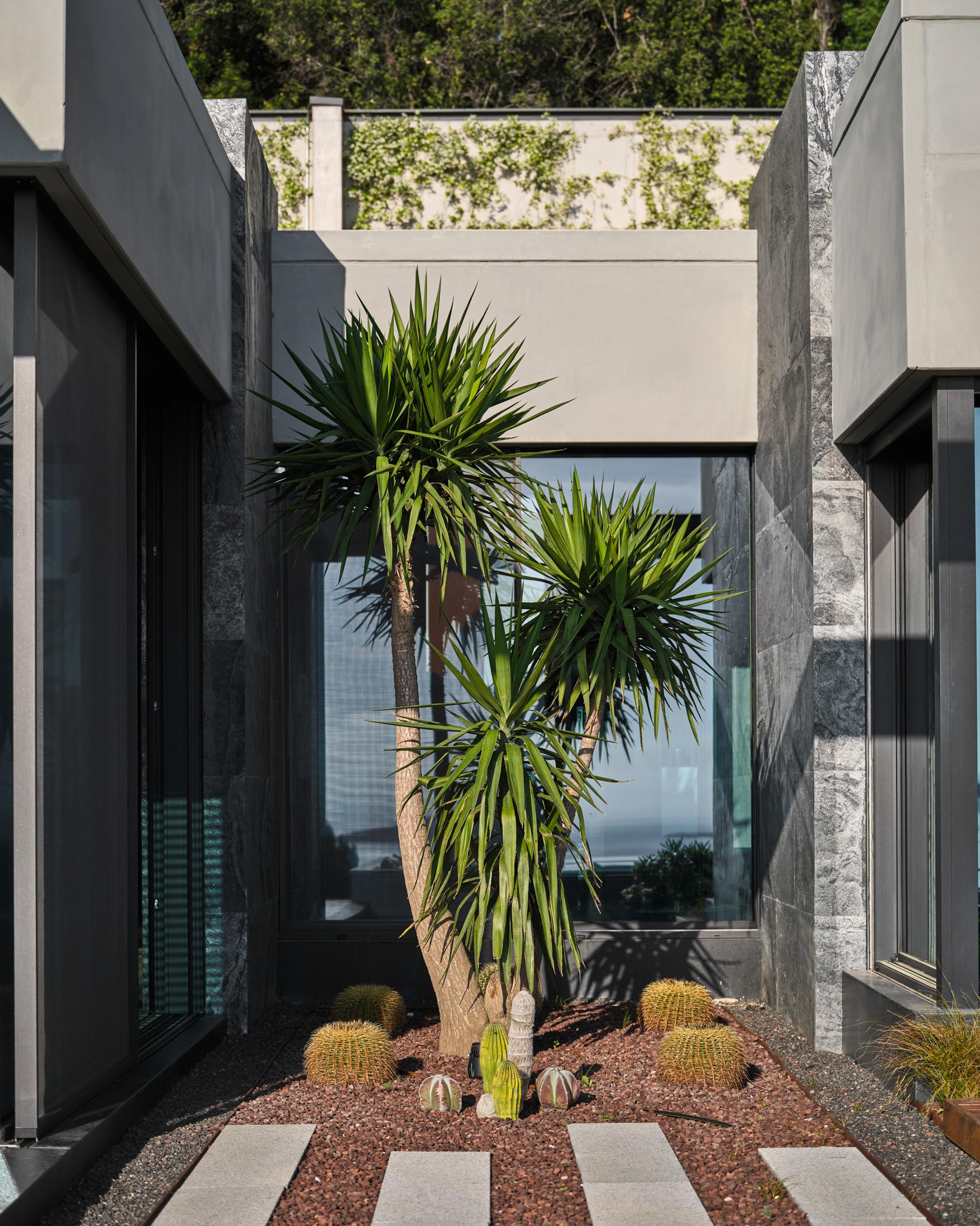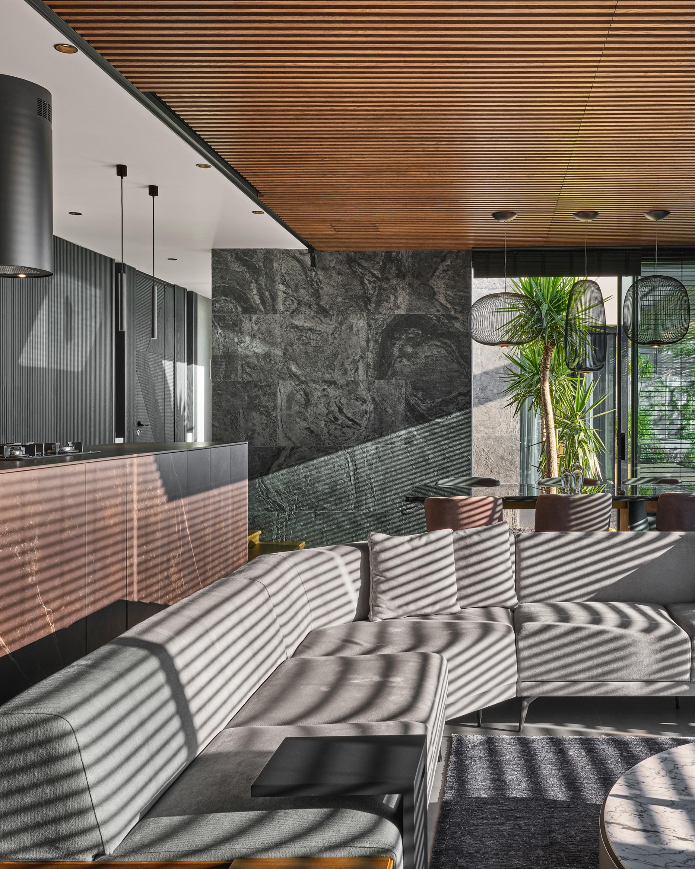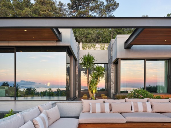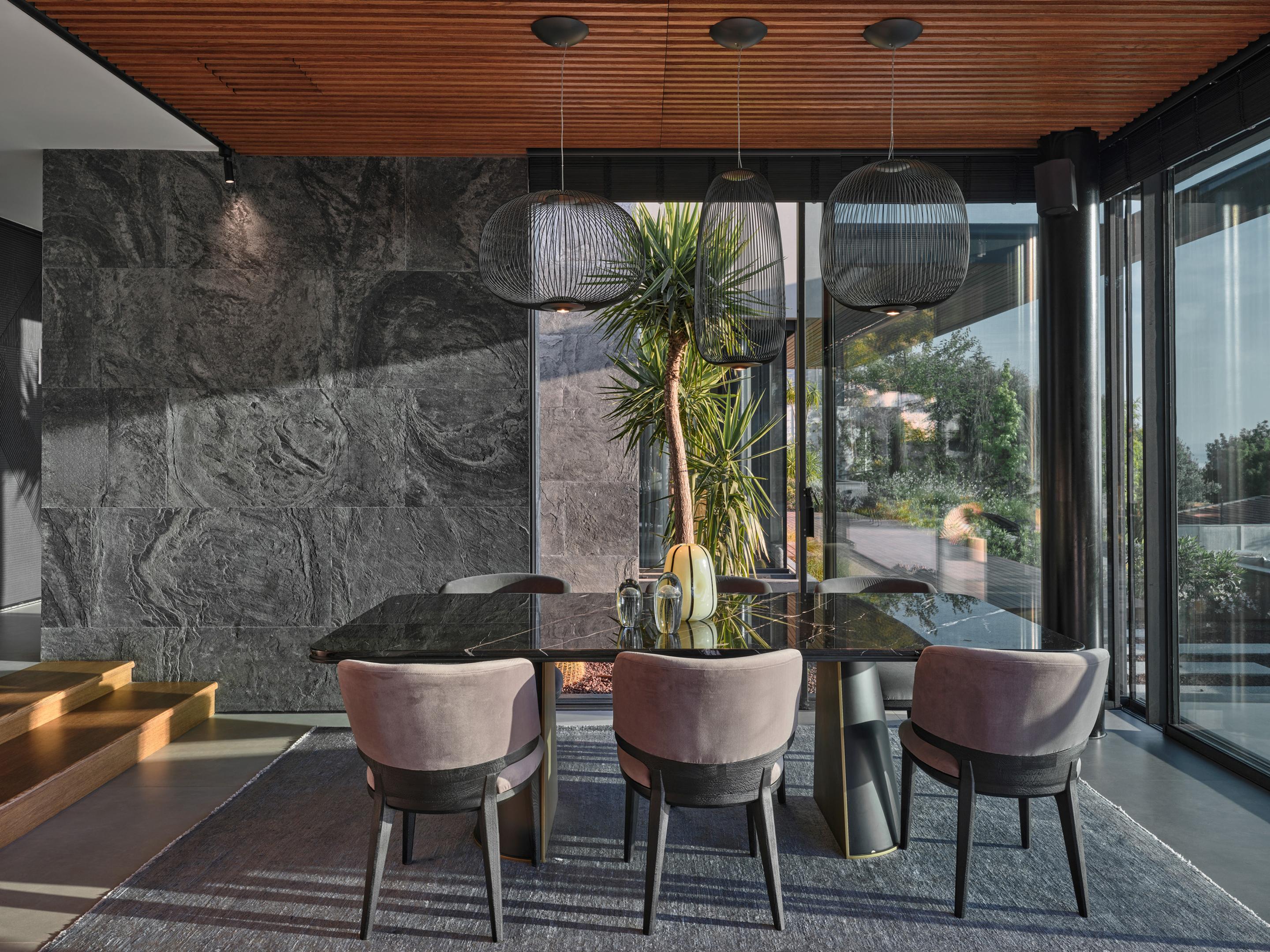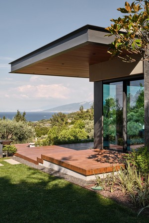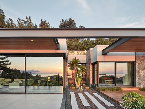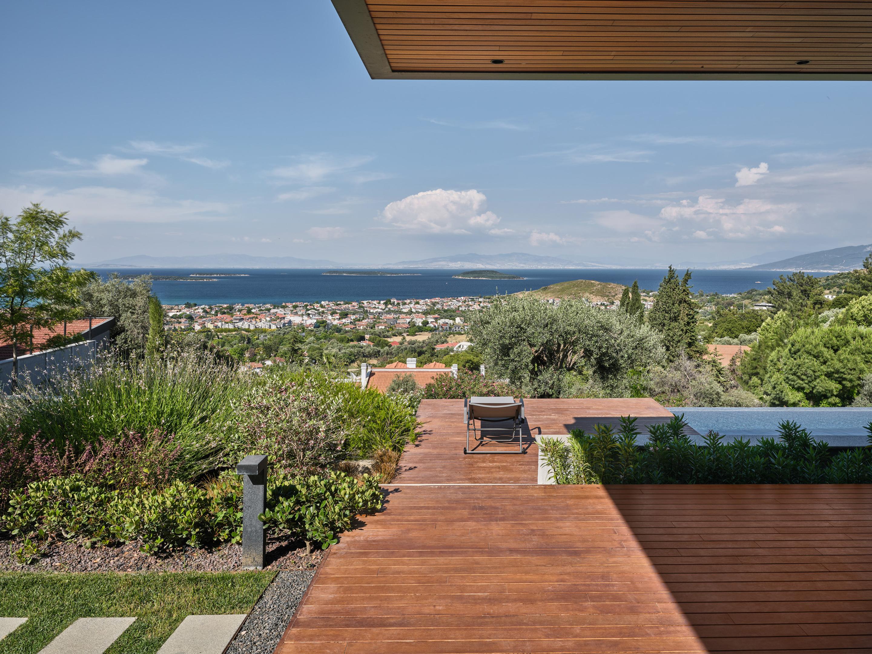Carved into the hillside, the house engages the terrain through a restrained architectural language. Its linear form follows the site’s natural contours, while expansive glazing blurs the boundaries between interior and exterior. Framed views of the Aegean Sea and olive groves anchor the home in its context, with all living spaces organized to enhance this uninterrupted visual connection.