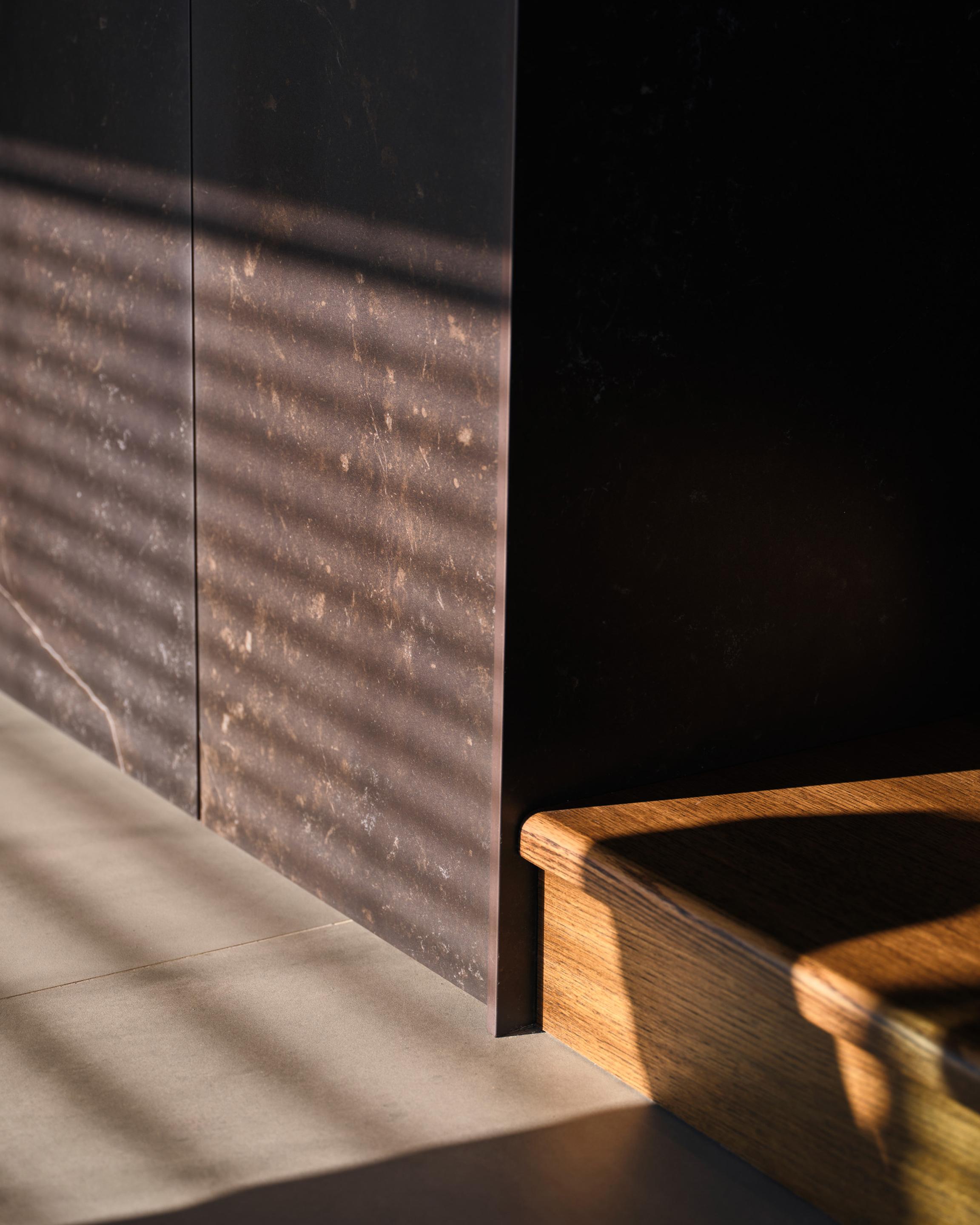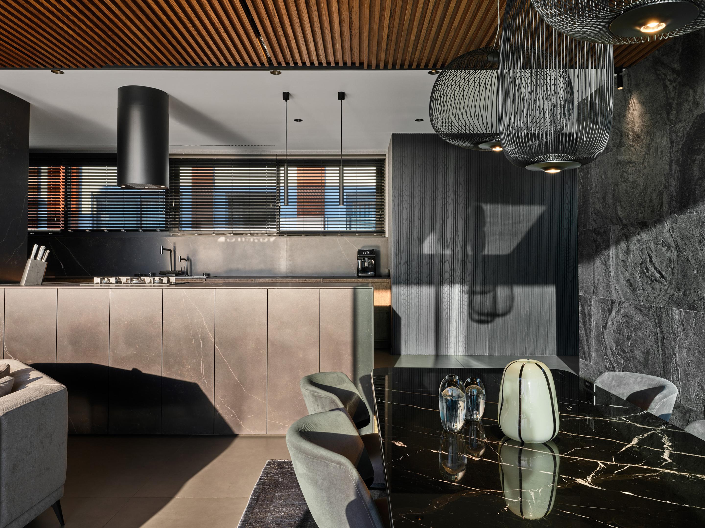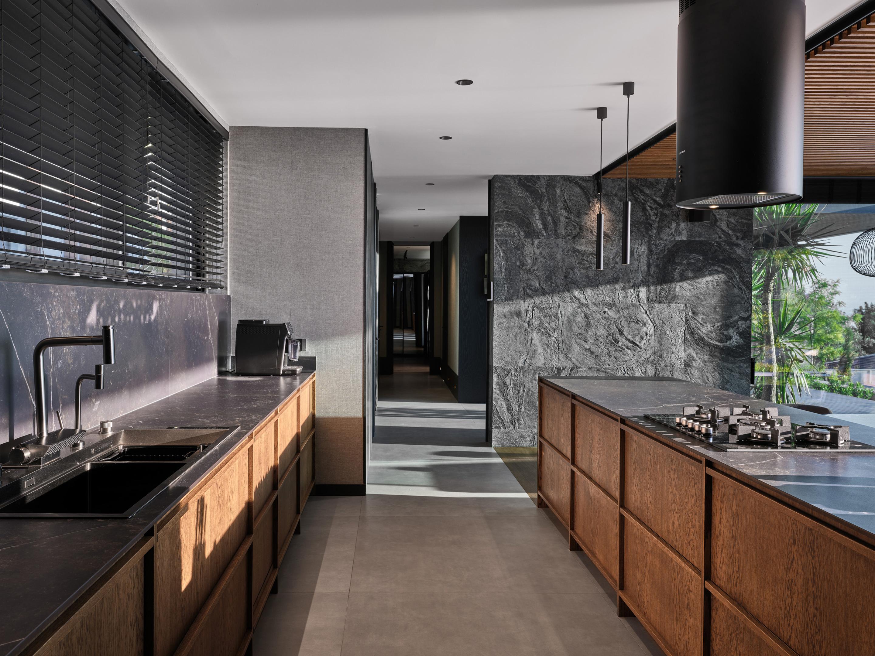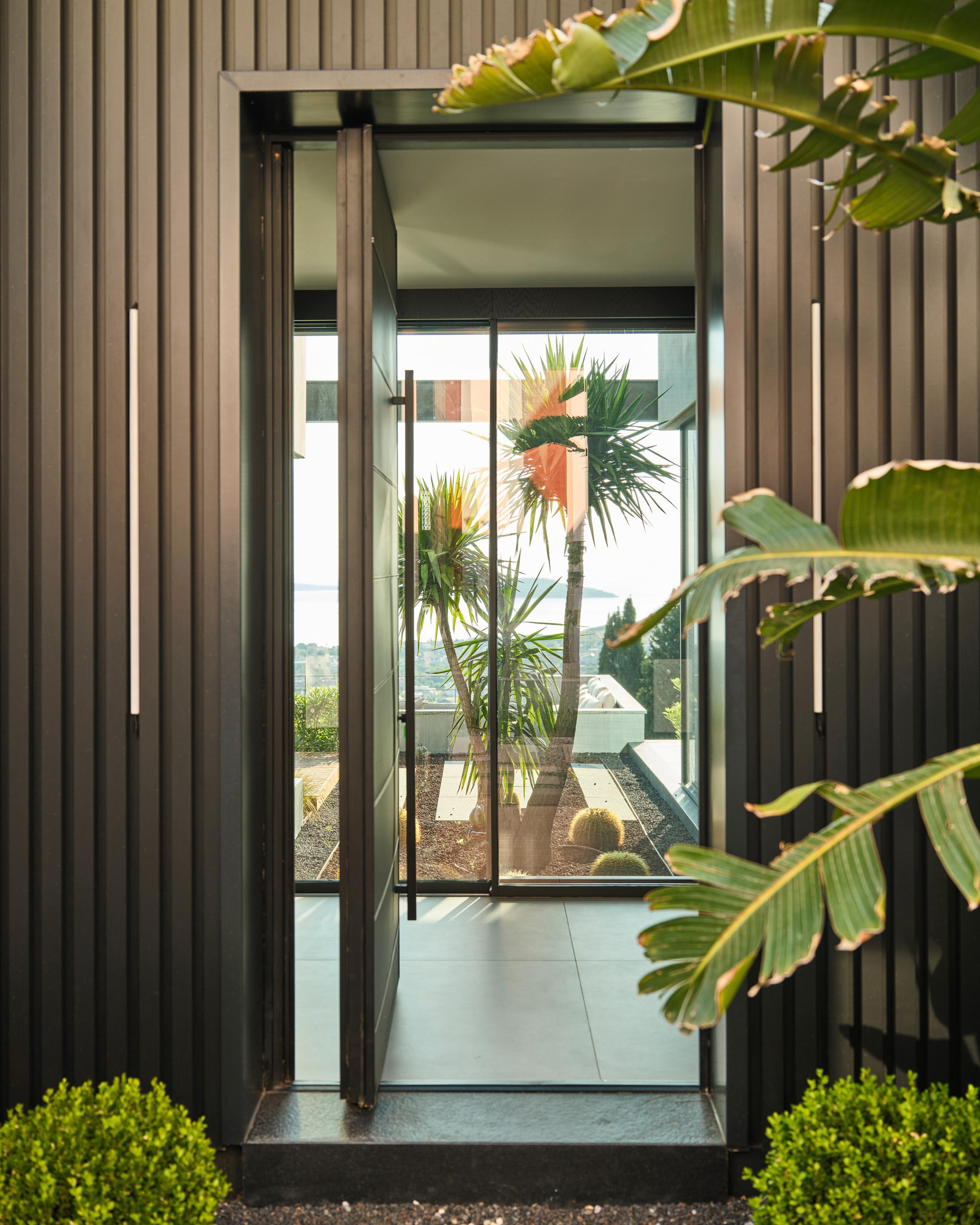 Carved into the hillside, the house engages the terrain through a restrained architectural language. Its linear form follows the site’s natural contours, while expansive glazing blurs the boundaries between interior and exterior. Framed views of the Aegean Sea and olive groves anchor the home in its context, with all living spaces organized to enhance this uninterrupted visual connection.